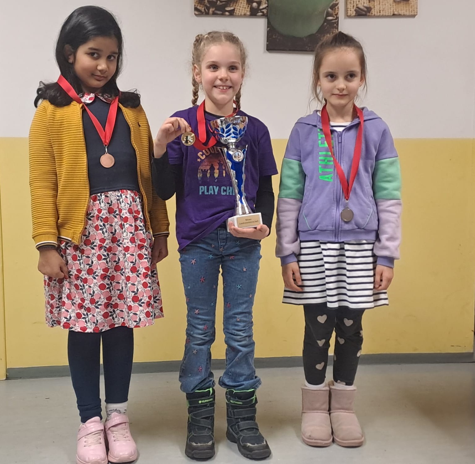 ![]() Bestes Mädchen des Turniers war (wie schon 2024) Paula Knittel-Templ, sie wurde mit 5 aus 7 Landesmeisterin U14. ![]() Turniersieger und Landesmeister U12 wird Niklas Keller (Mitte), Daniel Scheiber ist Zweiter U12 und insgesamt Dritter (links), Alexander Slutski wird Dritter in der U12 und Gesamtvierter ![]() Wir gratulieren allen Teilnehmer/innen zu ihren Erfolgen! |